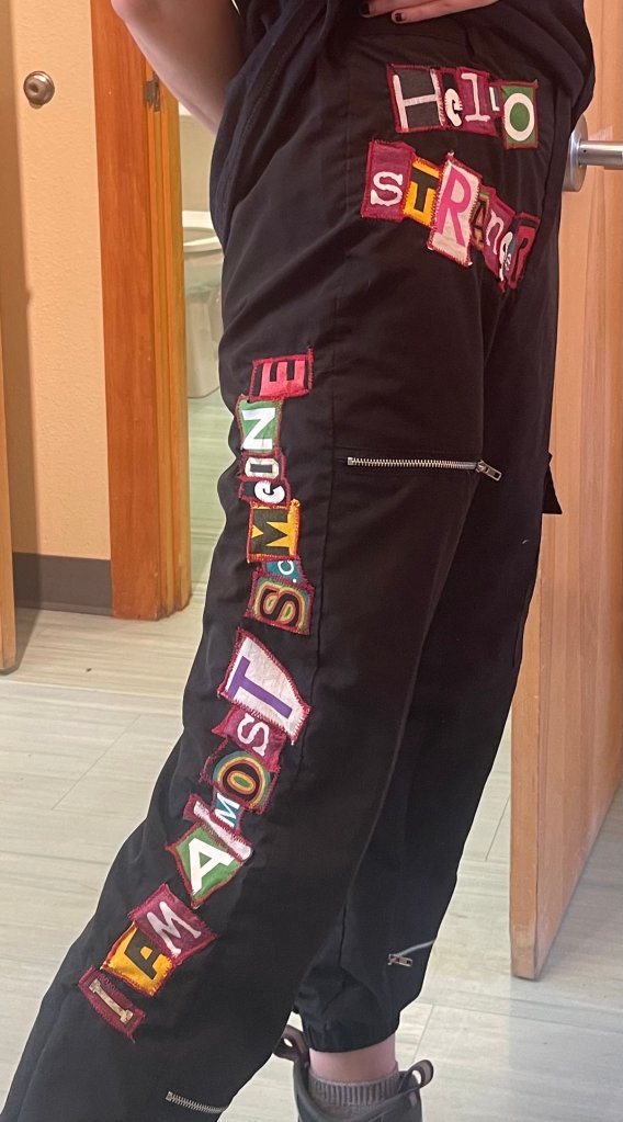 Once students have a sense of what they want to make, Morris and Rose take the class on a trip to a local thrift shop, where they’re given a budget of $20 to buy old clothes and fabrics to use in their upcycled clothing. (They go when the local store offers “Discount Tuesdays,” Morris says, and every item is on sale for just one dollar.) Then, for the final few weeks, students use sewing machines, embroidery machines, vinyl cutters, and heat presses to turn their designs into a reality; students either add new elements to the recycled clothing items to revitalize them, or create entirely new articles of clothing by cutting the old clothes into pieces and sewing those back together.