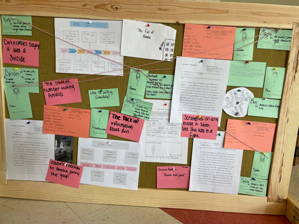 In small groups, students use the resources they’ve filled out to compile key facts onto an evidence board—much like you’d see in a police show, complete with red string linking related details together. When making their evidence boards, students can tap into their strengths: Some groups choose to focus on elucidating their thoughts through written flash cards, while others take the opportunity to put their art skills on display. Groups update their evidence boards throughout the course; the finished product is due at the end of the unit.